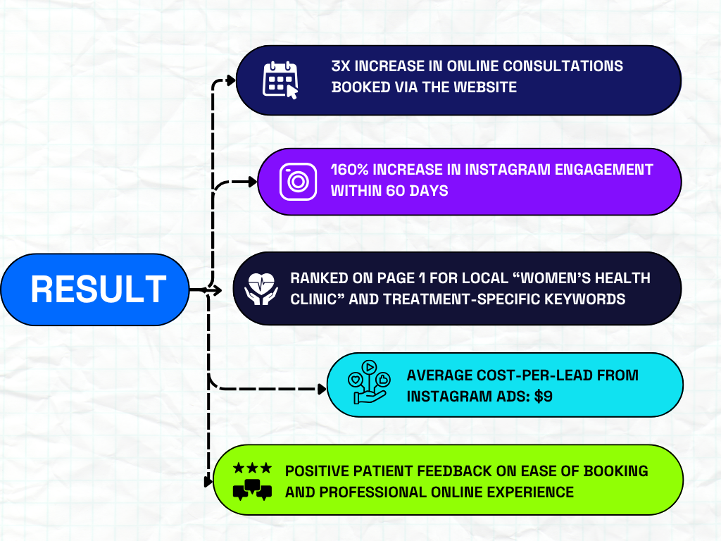 We developed an elevated brand identity that conveyed professionalism, warmth, and modern care. We rebuilt the site from the ground up and deployed a multi-platform campaign to reach women searching for personalised health and beauty services. Our strategy included: